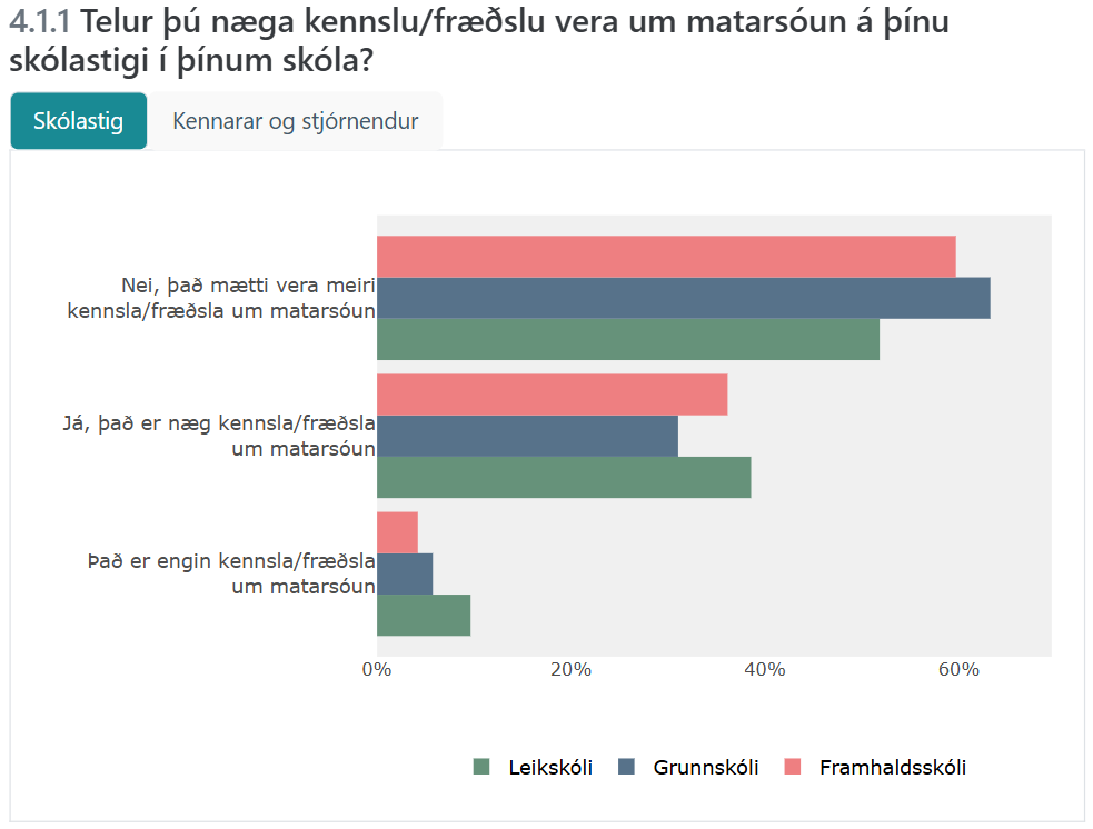 Þegar kennarar og stjórnendur voru spurð um matarsóun, svaraði rúmlega helmingur að það vantaði meiri fræðslu um matarsóun, en þó lægra hlutfall leikskólakennara miðað við aðra kennara. Leikskólakennarar vildu flestir bæta kennsluefni um matarsóun og flestir grunnskólakennarar vildu fjölbreyttara kennsluefni. Þá vildu framhaldsskólakennarar flestir auka þekkingu sína á málefninu. Leikskólakennarar nýta helst samtöl við nemendur og fræðslu um matarskammta til að kenna um matarsóun. Í grunnskólum er yfirleitt stuðst við bókina „Halló heimur“ eða myndbönd á youtube. Í framhaldsskólum er matarsóunarkennslan byggð á fræðslu og fyrirlestrum, kennslu um flokkun og kennsluefni í umhverfisfræðum.