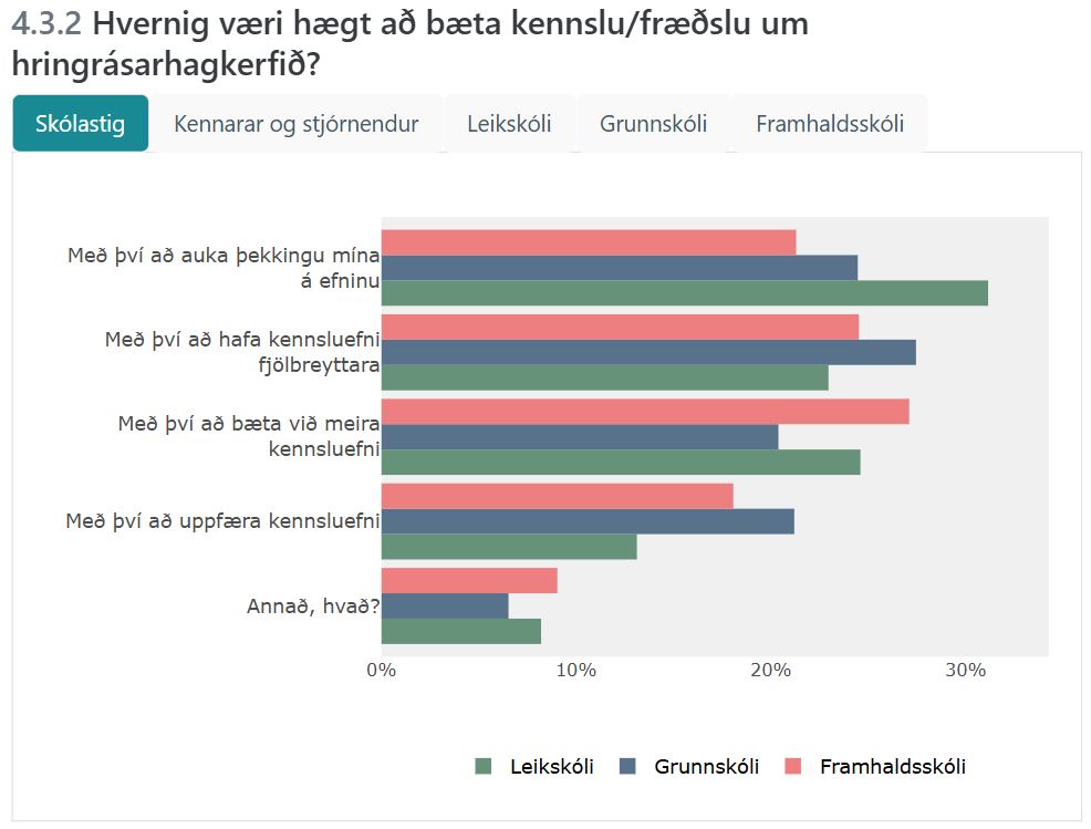 Meirihluti kennara finnst vanta meira og fjölbreyttara kennsluefni um hringrásarhagkerfi. Þetta sýna niðurstöður könnunar um stöðu á námsefni um hringrásarhagkerfi og matarsóun í skólum. Könnunin var hluti af Aðgerð 5 í aðgerðaráætlun stjórnvalda Minni matarsóun. Einnig voru lagðar til tillögur að aðgerðum til að bæta þekkingu um matarsóun og hringrásarhagkerfi í skólakerfinu. Könnunin var framkvæmd af Menntavísindastofnun og Menntavísindasviði Háskóla Íslands fyrir Umhverfis- og orkustofnun. Könnunin var lögð fyrir kennara, stjórnendur og kokka- og matráða í skólunum. Heildarniðurstöður má finna á síðu menntavísindastofnunar HÍ.